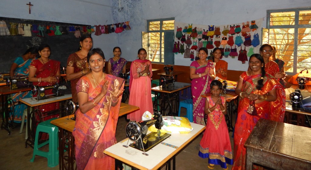 Na de lunch bezoeken we de training – naailes. De vrouwen zitten met 3 voor 1 stikmachine en moeten om beurten werken. We voegen naar de prijs van een stikmachine. 3000 tot 5000 Inr voor een gewone machine. Tot 8000 Inr voor een borduurmachine.